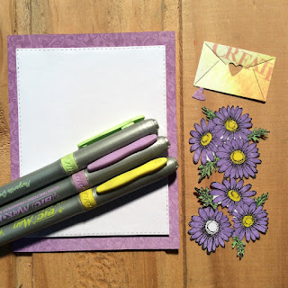 I also stamped Daisies (Deep Red Stamps), twice, fussy cut them and colored them with Polynesian Purple, Margarita Green, and Yellow Bliss BIC Markers. One of the flowers I cut apart to use later.