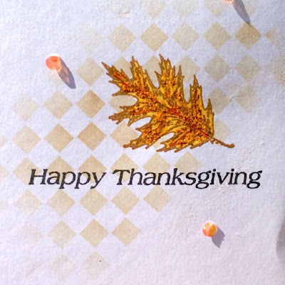 For the first card I blended Vintage Photo Distress Ink over a checkerboard stencil. Then I stamped the oak leaf with the Vintage Photo ink and, using a water brush I colored the leaf with the Sweet Corn and Tangerine Twist inks. Once dry, I stamped Happy Thanksgiving from the Thanksgiving Set from Anthony's Paper Craft with the Jet Black Amalgam ink, adhered some Orange Peel Stickles by Ranger to the leaf, and a few orange sequins to the front.